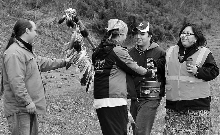 Carol Hopkins, far right, hands off a bucket filled with water from the Pacific Ocean to Echo Brown, while Neejig Shognosh gives an eagle staff to Chaney Bell in Woods Bay on Tuesday morning. The items have been carried by multiple participants as part of the western portion of the Mother Earth Water Walk. Both items will be carried on foot from Puget Sound, Wash., to Bad River, Wis.