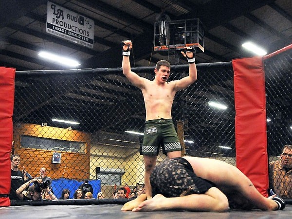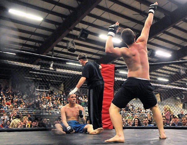 Kalispell's Michael Wilson lifts his arms up in a combination of exhaustion and victory after defeating Adam North of Howard, S.D. during the annual Kalispell Kombat on Friday evening.