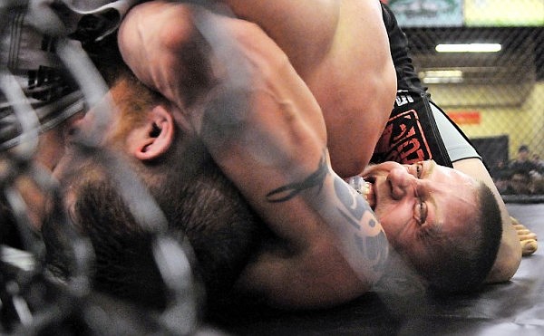 Great Falls' Phillip McClendon grits his teeth as he squeezes his arms around Bozeman's Kent Johnson during the annual Kalispell Kombat at Majestic Valley Arena on Friday evening.
