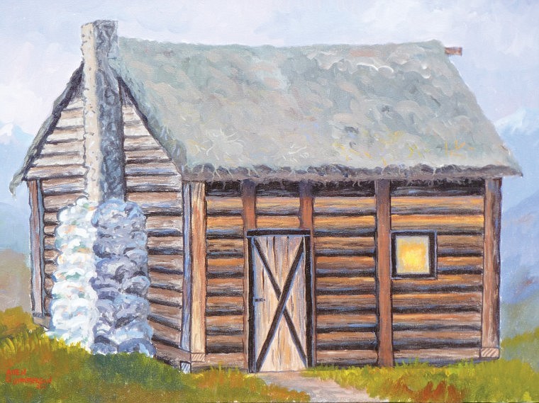 This oil painting by artist Allen Jimmerson recreates Howse House, the first fur trading post in the Flathead Valley founded for the Hudson's Bay Co. by Joseph Howse in 1810-11. It was located south of Kalispell near American Indian trails close to the Flathead River. Jimmerson worked from specifications for fur trading outposts developed by Hudson's Bay Co. and the North West Co. A celebration in Kalispell's Lawrence Park on Saturday celebrates the 200th anniversary of the trading post founding.