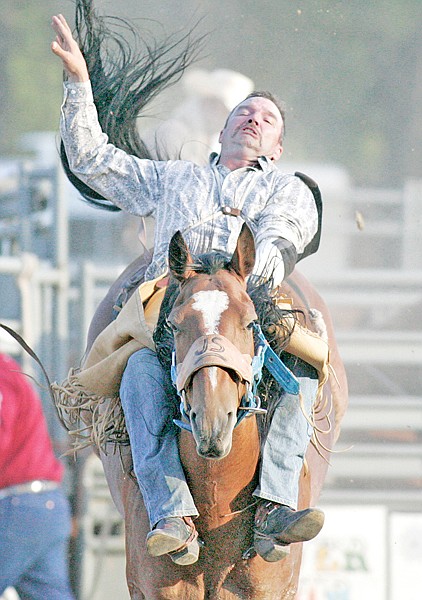 Ben Wrzesinski of Boulder, MT aboard "Stop Debt" for a bareback ride worth 82 points Friday.