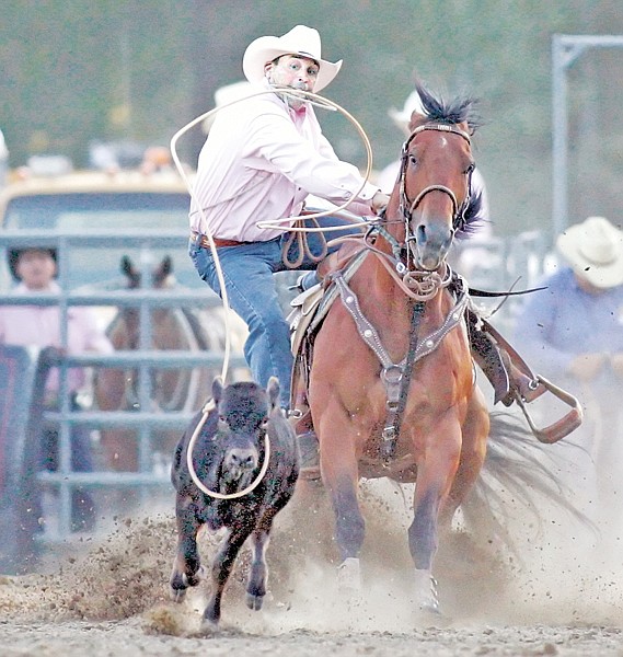 Brant Davis of Sand Coulee, MT with a time of 10.1 in the tie down roping Saturday night.