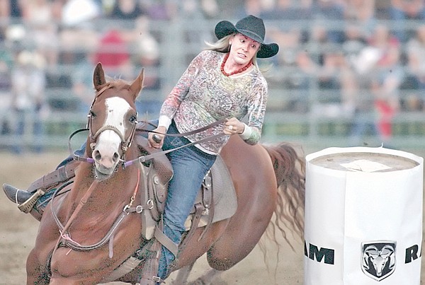 Brittanee Tower of Wilbur, WA with a watchful eye as she bumps the second barrel Friday night.