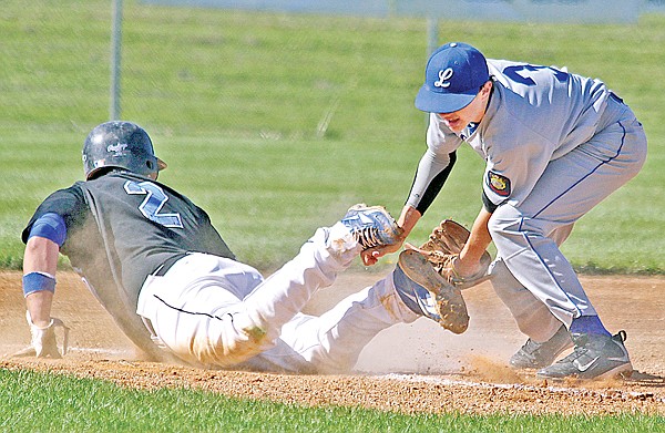 #3 Will Reichel tags out Fort Macleod's Hayden Shackel vs. Fort Macleod, state baseball in Polson 7-28-11