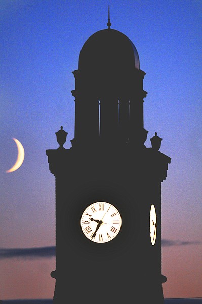 The moon hangs low in the sky Tuesday evening beyond the clock tower in Whitefish.