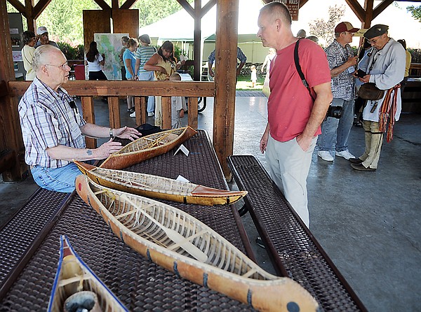 From left, Tom Rogers of Kalispell discusses his one-quarter scale canoes with Greg Holmes of Langely, B.C., on Saturday afternoon at the Mountain Man Rendezvous in Lawrence Park in Kalispell. Rogers said the pieces are based on information from the Smithsonian Museum.