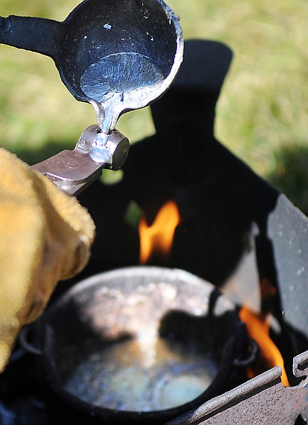 Libby resident Mike Cohan, decked out in historically accurate clothing, hunched over a small, scorching pot containing melting chunks of lead.