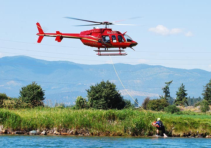 On Saturday, search and rescue personnel — along with members of the ALERT helicopter team, Swan Mission Search and Rescue, the Flathead County Sheriff’s Office and Montana Fish, Wildlife & Parks — gathered near Sportsman’s Bridge on the Flathead River to participate in a helicopter tow rescue training exercise. In all, about 50 people participated in the simulation.