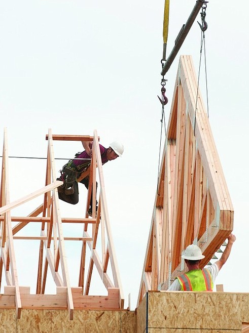 Workers guide a truss into place as it is lowered onto the frame of the new addition at Buffalo Hill Terrace Thursday morning.