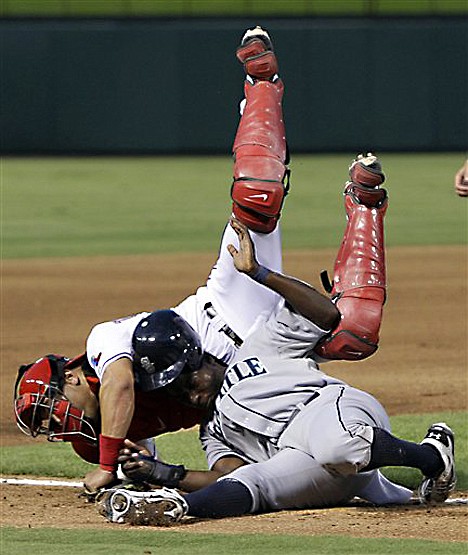 Robinson was bowled over while being tagged out by Torrealba in a rundown in the fourth. Robinson started running on a hard chopper to third baseman Michael Young, who immediately threw home.