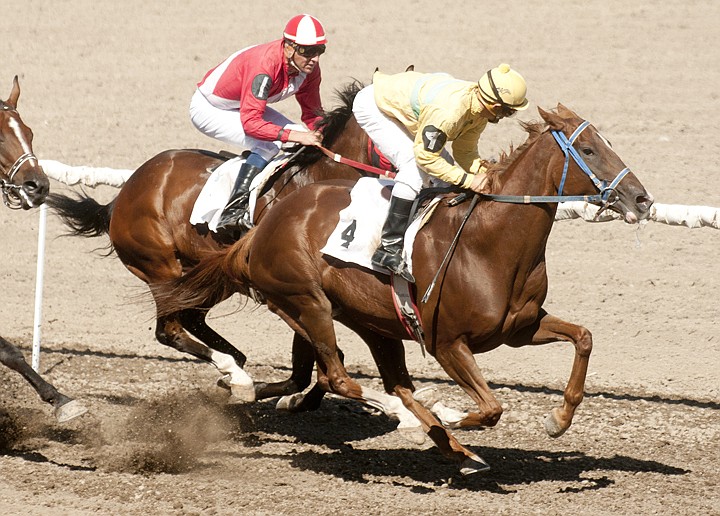 Orlando O'Farrill, right, riding No Baggage, keeps an eye on the position of Rodd Thomas, on Mitt, during the second race of the Kalispell Race Meet at the Flathead County Fairgrounds Friday afternoon.