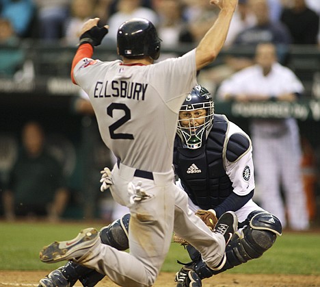 Pedroia then lifted a flyball to medium right field. Suzuki threw a one-hop strike to catcher Josh Bard. Ellsbury slammed his left knee into Bard's headgear and was initially called safe by home umpire Mark Ripperger.