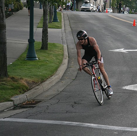 After jogging across the beach, they boarded their bikes and rolled through downtown Coeur d'Alene. All told, the cycling section was 40 kilometers of hard pedaling.