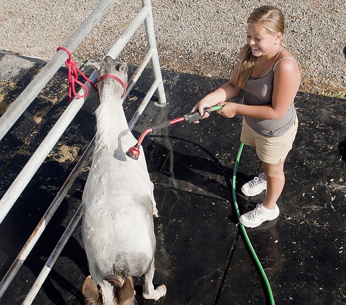 Gabrielle Sutton gets Pixie ready for the 4H miniature horse judging at the Northwest Montana Fair Monday morning. Sutton also plans to enter PIxie in the open miniature horse show on Thursday.