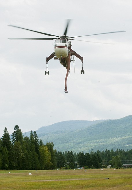 A Sikorsky CH-54B Tarhe lands at Ferndale Airfield to be refueled Monday afternoon. The Tarhe is capable of holding up to 2,000 gallons of water.
