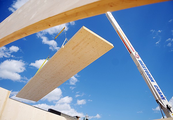A floor plate weighing more than two tons is hoisted and lowered into place on Tuesday afternoon in Whitefish. According to Pete Kobelt of Innovative Timber Systems construction is on schedule to have the building up with in five days.