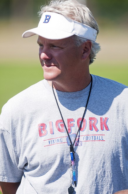 Bigfork head football coach Todd Emslie watches practice last Wednesday at Bigfork High School.