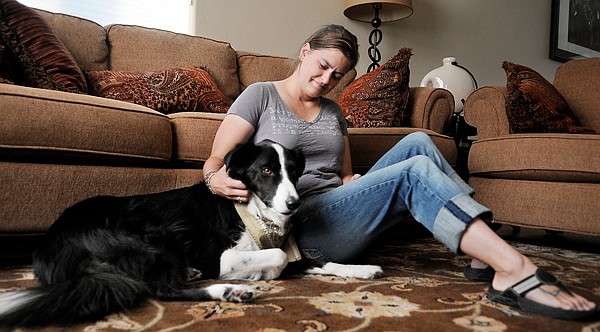 Kate Moseley and her dog Hopkins, a two-year-old Border Collie, sit in their livingroom on Wednesday morning in Columbia Falls. "I've taken this animal into my house and promised to raise and take care of him," said Moseley. "I can't let him suffer when I know I could do something about it."