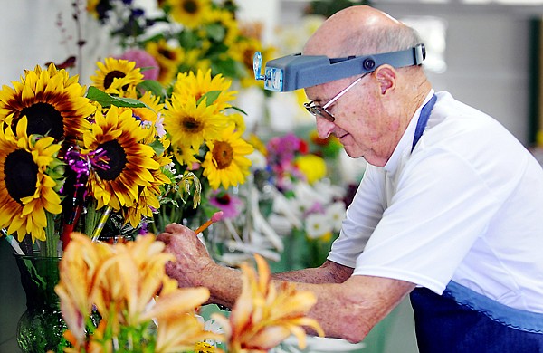 Floriculture judge Bill McClaren closely examines a bouquet of sunflowers on Wednesday morning at the Northwest Montana Fair in Kalispell. McClaren judges the flowers on maturity, uniformity, spacing, shape and form.