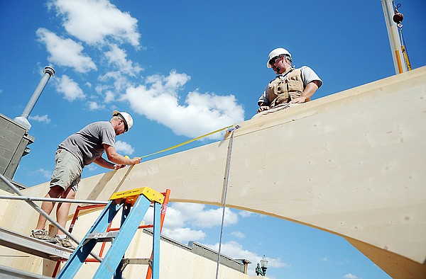 Dangling from a crane in downtown Whitefish, a 40-foot-by-8-foot wooden floor plate weighing 4,400 pounds slowly swings into place — not your typical piece of construction material.
