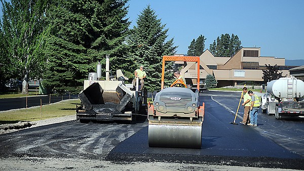A paving crew works to smooth out a new layer of asphalt on the driveway to Edgerton School on Aug. 4. Classes start Wednesday at Edgerton and other Kalispell schools.