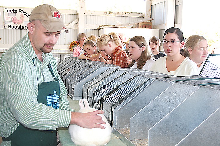 Bepple, rabbit superintendent at the Grant County Fair and a rabbit breeder, estimates 80 percent of the rabbits shown at the commercial market rabbit judging Tuesday were provided by him.