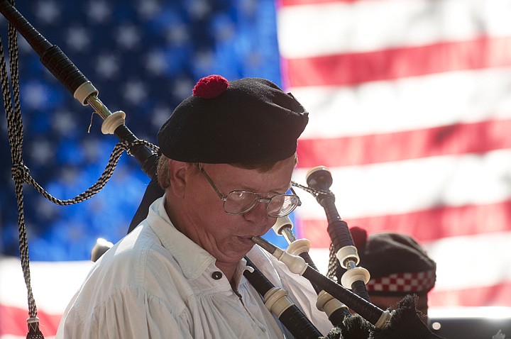Dick Bratton tunes his bagpipe before the Northwest Montana Fair Parade on Friday morning. Bratton walked in the parade with the Montana Highlanders.