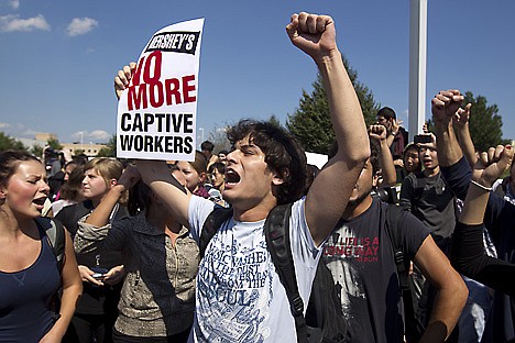 HERSHEY, Pa. - Foreign students working at a candy warehouse protested conditions and pay for a second day Thursday, chanting on Chocolate Avenue under streetlights shaped like Hershey's Kisses, arguing that they were employed under the guise of a cultural exchange but toil away in what amounts to a sweets sweatshop.