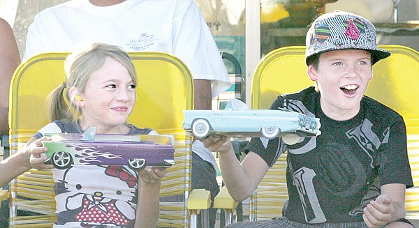 Cousins Chloe Cole, left and Tanner Parks shout "burn out, burn out" and participants did exactly that Friday night as the Igniters 50th anniversary and car show got underway.