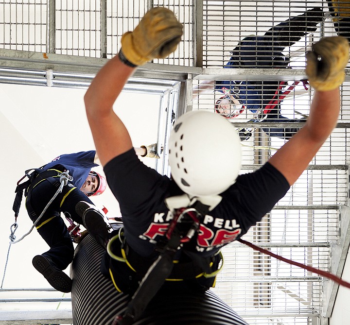 Jason Schwaiger, left, is carefully lowered into position while practicing a ropes rescue during a training exercise at the Kalispell Fire Department North Station on Wednesday afternoon.