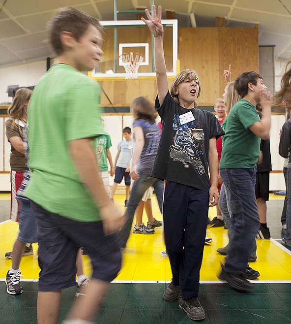 Jorden Jensen, center, holds up four fingers to display his shoe size during ice-breaking exercises at Kila School on Thursday morning. Students raced around the gym to form groups based on eye color, age and shoe size.