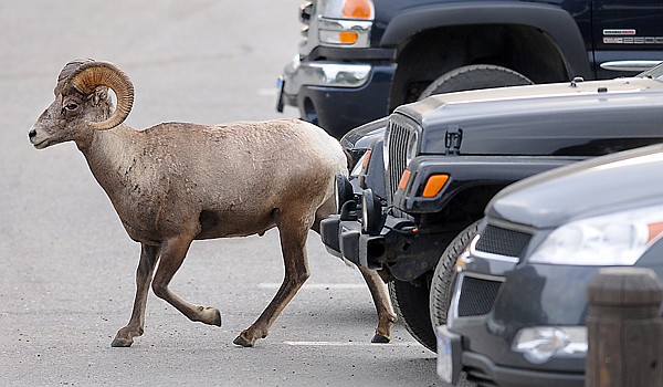 A bighorn sheep makes its way through the parking lot at Logan Pass on Thursday morning in Glacier National Park.