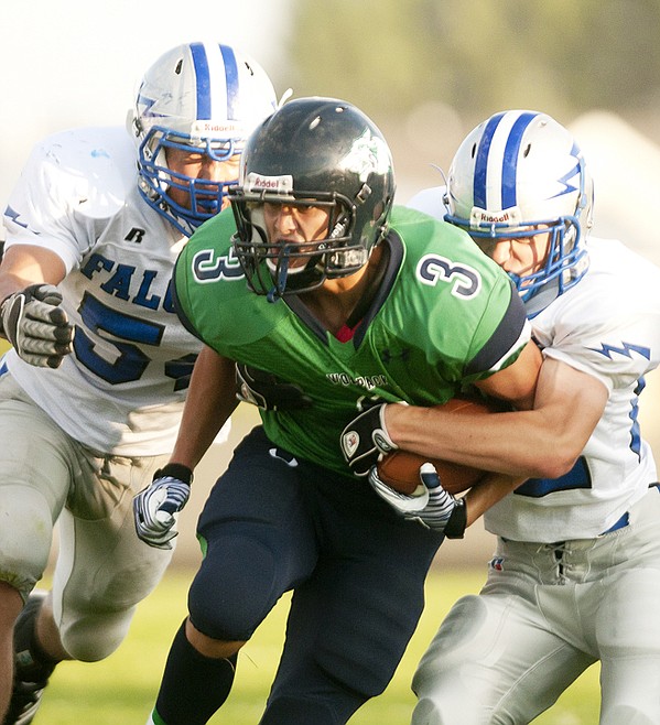 Glacier running back Kyle Griffith (3) breaks a tackle by a Billings Skyview defender on a run Friday night at Legends Stadium.