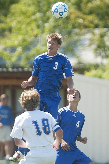 Stillwater Christian School's Joshua Bray (3) goes up for a header as teammate Travis Kauffman (4) and Columbia Falls's Kevin Shea (18) look on during Saturday's nonconference soccer match in Columbia Falls.