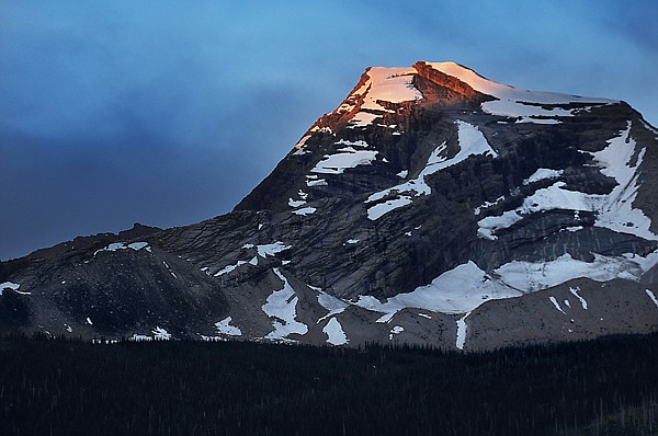 The 8,987-foot summit of Heavens Peak catches the first rays of sunrise in Glacier National Park.