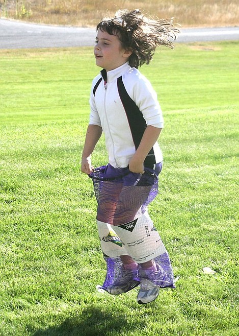 Molly Patko takes the lead in a potato sack race during the first annual Fall Fitness Fun Day Saturday morning.