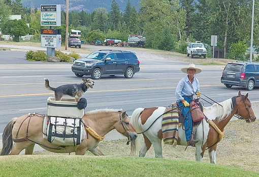 It's not often you see a woman, two horses and her dog riding in a basket through Columbia Falls.