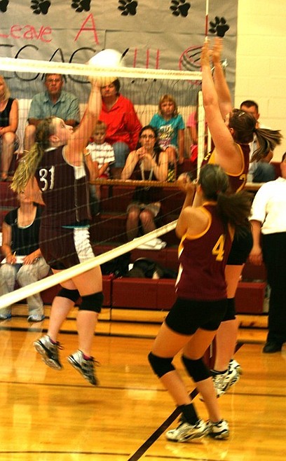 Alberton junior Mariah Turnull spikes the ball over two Philipsburg players Saturday evening in Alberton.