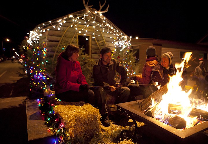 From left, Jessica Muir, Dan Muir, Christiane Hinterman and Cindy Woods roast marshmallows on the U.S. Forest Service float at the Night of Lights parade Friday night in Columbia Falls.