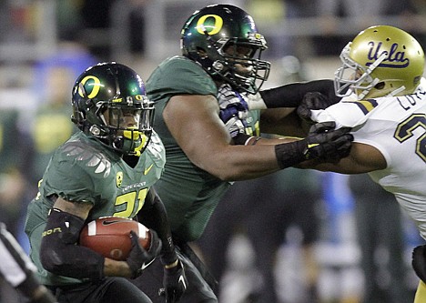 LaMichael James ran for 219 yards and three touchdowns and No. 8 Oregon beat UCLA 49-31 in the inaugural Pac-12 championship game Friday night at Eugene, Ore., for the Ducks' third straight conference title and a berth in the Rose Bowl.