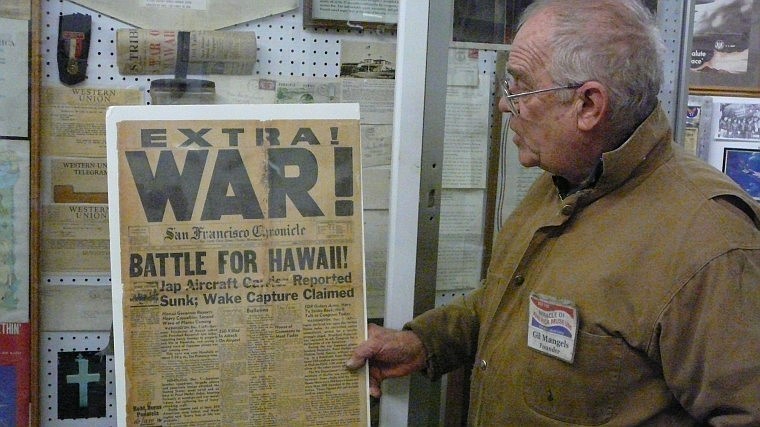 Gil Mangels, at the Miracle of America Museum, looks at the Dec. 8, 1941 front page of the San Francisco Chronicle.