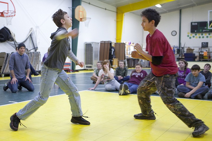 Aden YoungBird, right, and Jorden Jensen perform a stage combat routine at Kila School Monday afternoon. Members of Montana Shakespeare in the Parks taught students the basics of fighting on stage as part of their "Shakespeare in the Schools" tour.