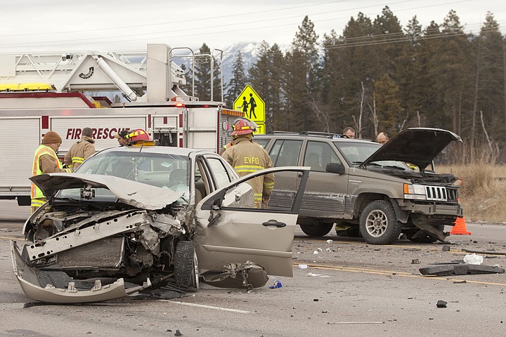 Kalispell and Evergreen emergency crews inspect the damage of a head on collision on U.S. 2 near Rose Crossing Tuesday morning. One female was transported to the hospital in stable condition.