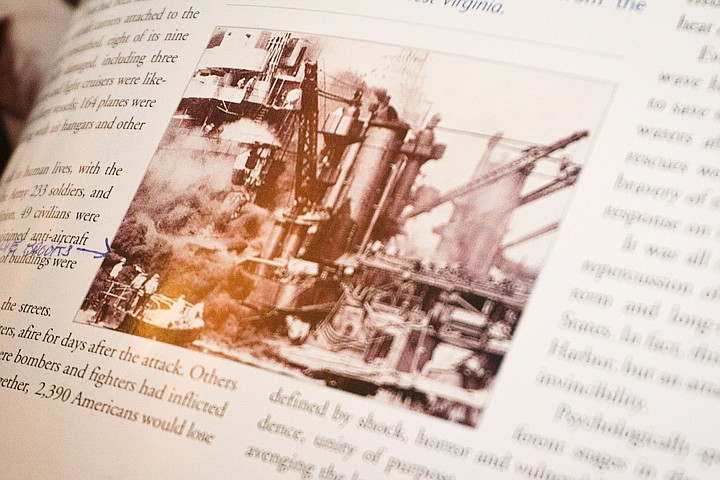 "There's dad," she says, pointing to a black and white picture that depicts a motor launch headed out toward the USS West Virginia engulfed in black smoke. The men on the small boat are about to pull a survivor out of the water.