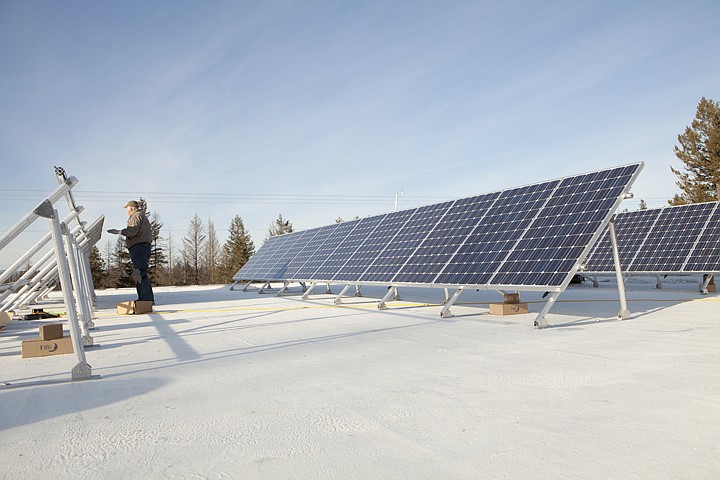 Tom White of Mother’s Power installs solar panels Wednesday morning on the roof of the Midway Mini Mart on U.S. 93.