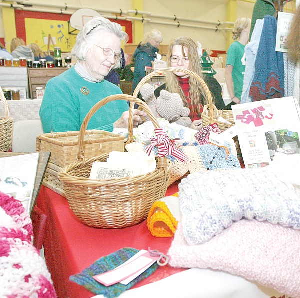 Jeanie Winstrom, right, looks on as Mariel Cole puts the finishing touches on a crocheted Teddy bear Saturday during the Christmas Craft Show at Morrison Elementary in Troy.