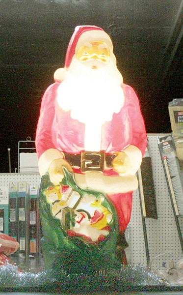 Santa stands guard every evening over Gambles Hardware in downtown Troy.