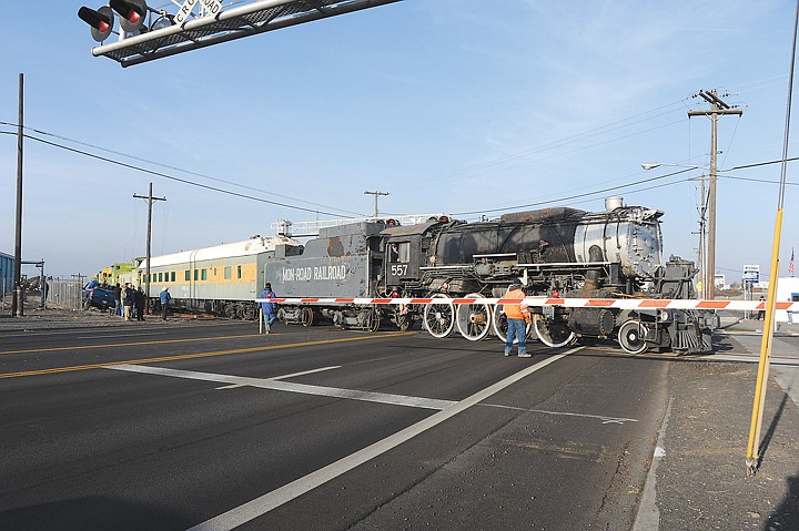 Locomotive 557 moved slowly across West Broadway Avenue Thursday afternoon, the start of a long journey that ends in Anchorage, Alaska, where it will be restored.