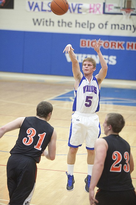 Bigfork's Ian Lorang (5) drains a three-point shot over Eureka's Chris Ibach (31) and Ryan Holder (23) during the Vikings' win at home over the Eureka Lions Thursday night.