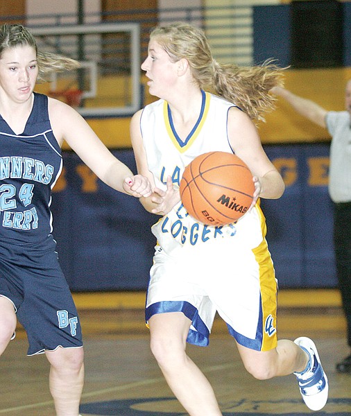 Badger Jenna Gust pours on the pressure as senior guard Jenny Johnson looks to pass first quarter vs Bonners Ferry 12-13-11.